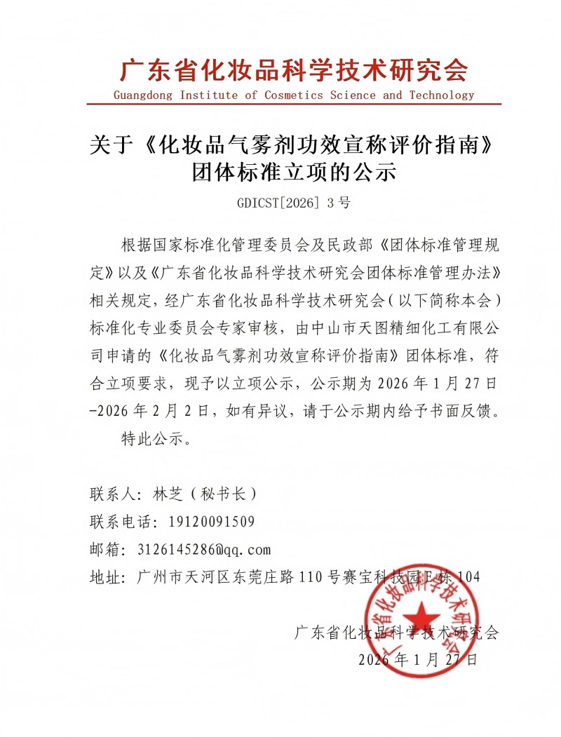 根据国家标准化管理委员会及民政部《团体标准管理规定》以及《广东省化妆品科学技术研究会团体标准管理办法》相关规定,经广东省化妆品科学技术研究会(以下简称本会)标准化专业委员会专家审核,由中山市天图精细化工有限公司申请的《化妆品气雾剂功效宣称评价指南》团体标准,符合立项要求,现予以立项公示,公示期为2026年1月27日-2026年2月2日,如有异议,请于公示期内给予书面反馈。