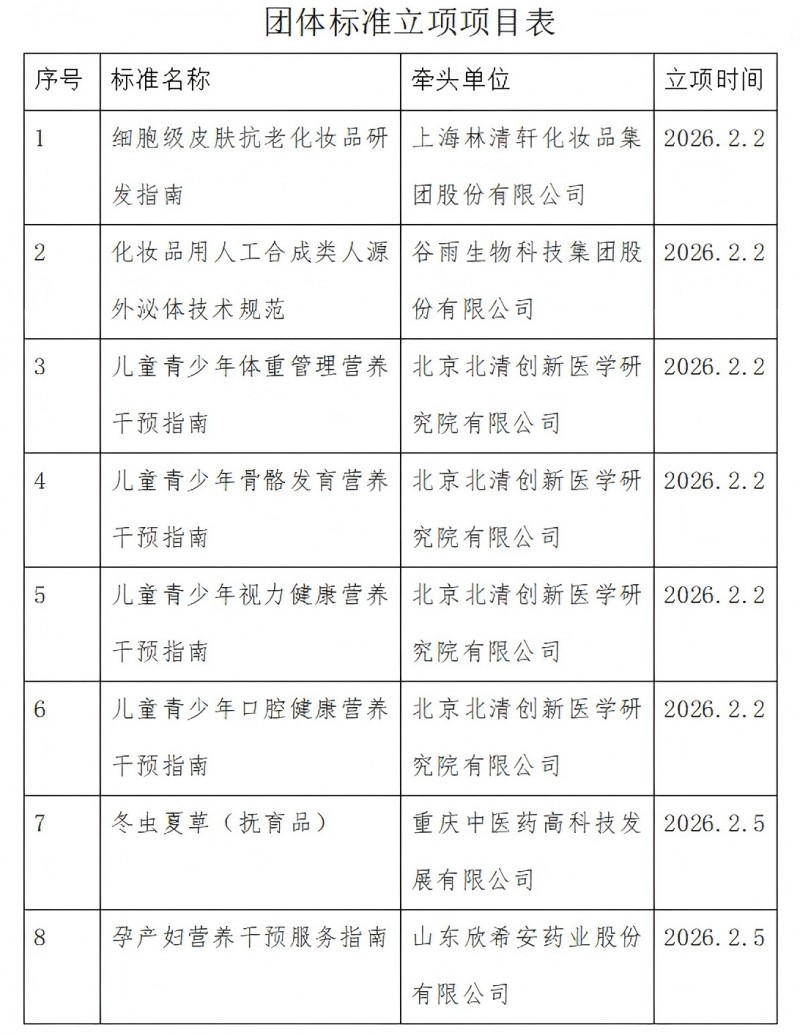 根据《中国食品药品企业质量安全促进会团体标准管理办法》有关规定,经专家评审及中国食药安全促进会审批,同意由上海林清轩化妆品集团股份有限公司提出的《细胞级皮肤抗老化妆品研发指南》等八项团体标准立项,特此公告。