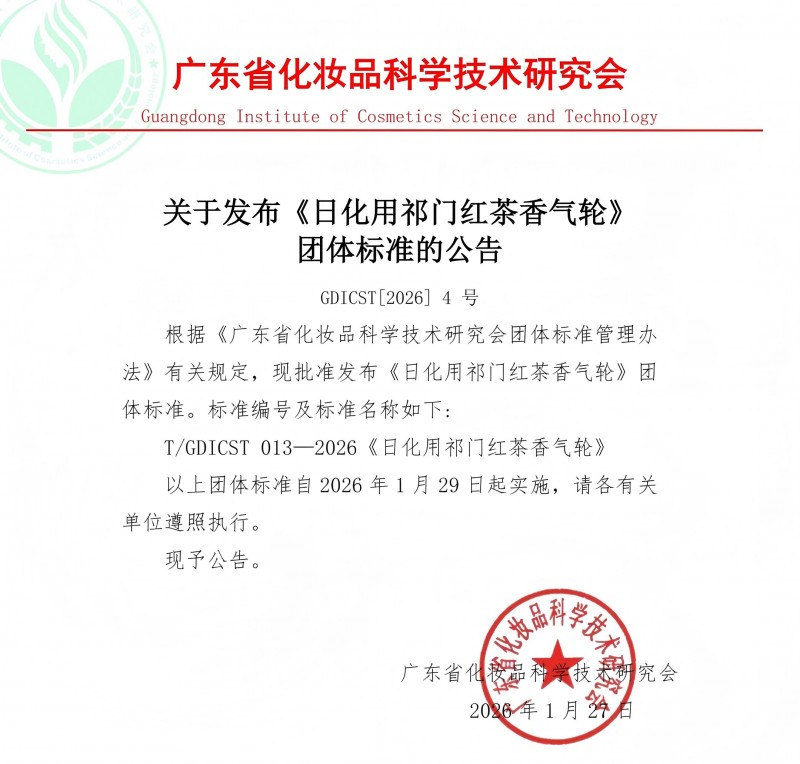 根据《广东省化妆品科学技术研究会团体标准管理办法》有关规定,《日化用祁门红茶香气轮》团体标准完成了编制、研讨、对外征集意见、专家审查、报批等流程,已正式发布。标准编号及标准名称为:T/GDICST 013—2026《日化用祁门红茶香气轮》,标准自2026年1月29日起实施,欢迎各有关单位采标。