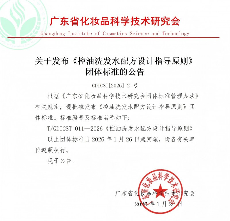 根据《广东省化妆品科学技术研究会团体标准管理办法》有关规定,《控油洗发水配方设计指导原则》团体标准完成了编制、研讨、对外征集意见、专家审查、报批等流程,已正式发布。标准编号及标准名称为:T/GDICST 011—2026《控油洗发水配方设计指导原则》,标准自2026年1月26日起实施,欢迎各有关单位采标。