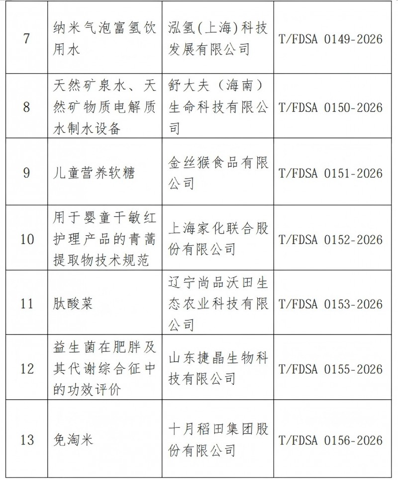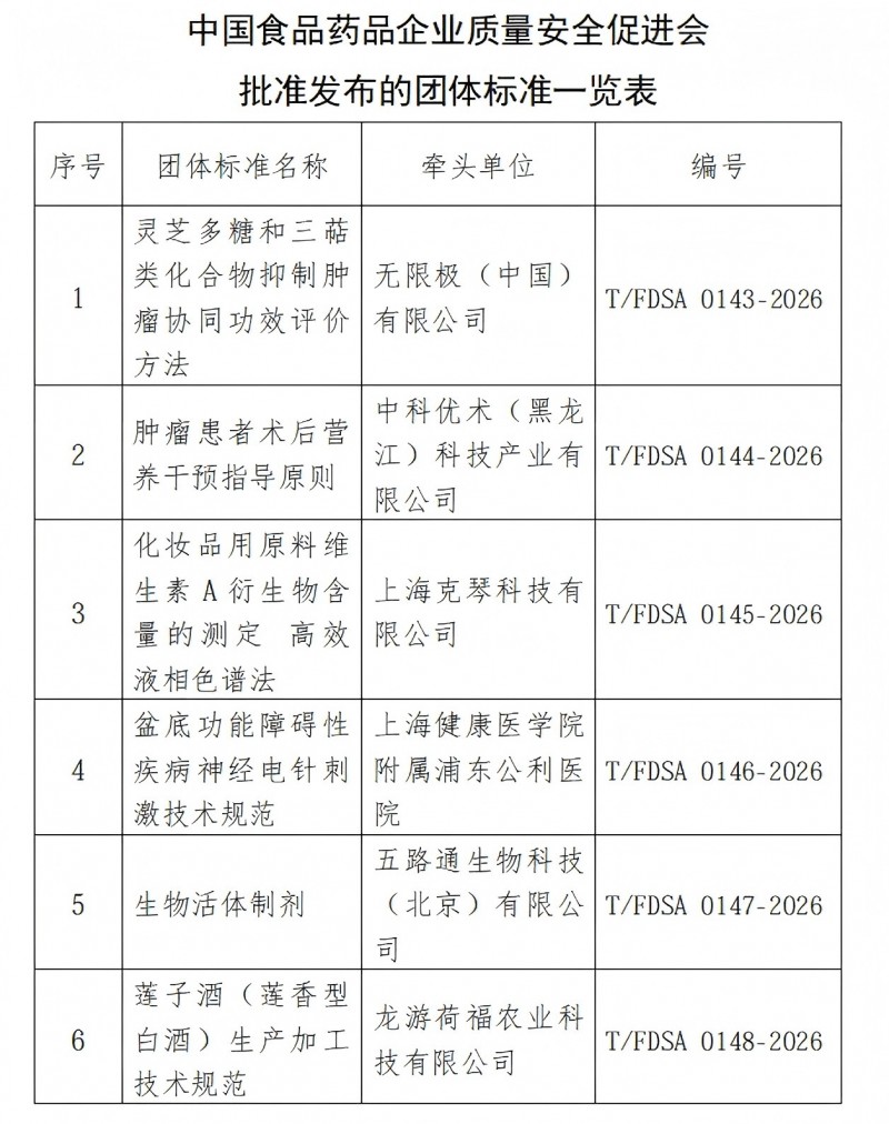 根据《团体标准管理规定》和《中国食品药品企业质量安全促进会团体标准管理办法》规定,我会批准发布由无限极(中国)有限公司等提出的《灵芝多糖和三萜类化合物抗肿瘤协同功效评价方法》(T/FDSA 0143-2026)等十三项团体标准,自2026年5月22日起实施。